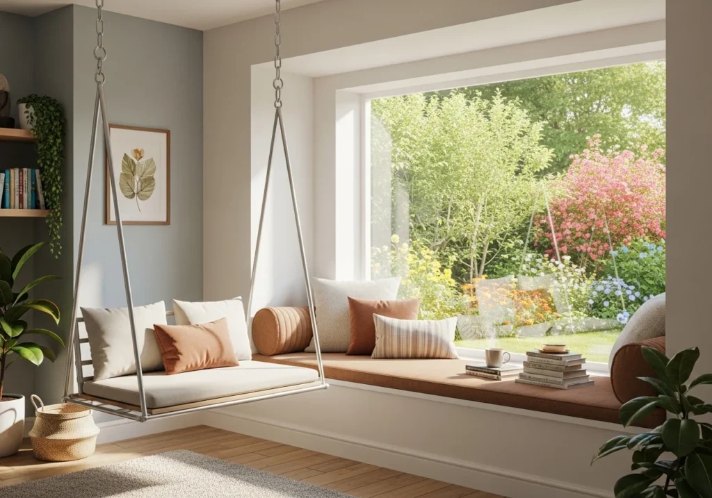 Step 5: Keep books nearby. Place a small shelf, wall rack, or basket close to your seat. Easy access to books keeps the nook functional and ready to use.